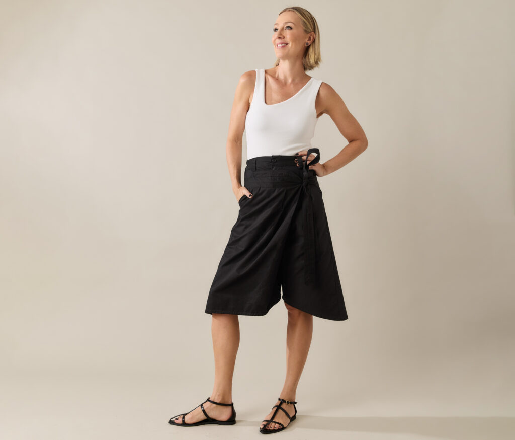 A Bermuda Surpresa, tem nome certeiro: quando vestida, engana os olhos e parece uma saia. A modelagem ampla e assimétrica, com amarração frontal, cria esse efeito inesperado e cheio de charme.
