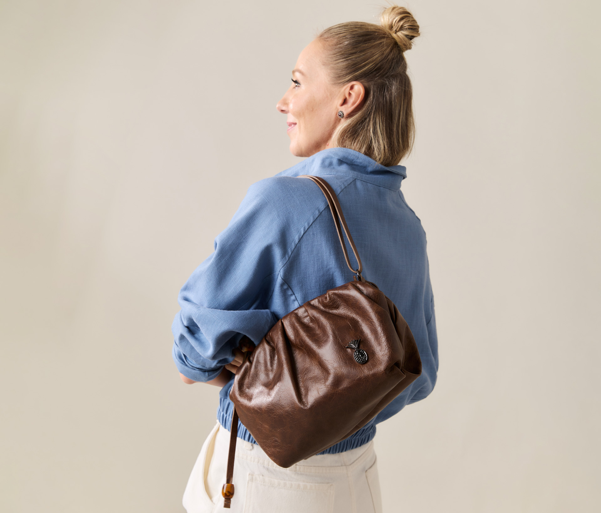 Couro marrom com ranhuras, caimento molinho e um formato que se acomoda ao corpo, essa é a Bolsa Topa Tudo. O nome já entrega: ela topa o que vier. Vai com looks relax, dá um charme extra no visual arrumado. Uma daquelas peças que fazem bonito com zero esforço.