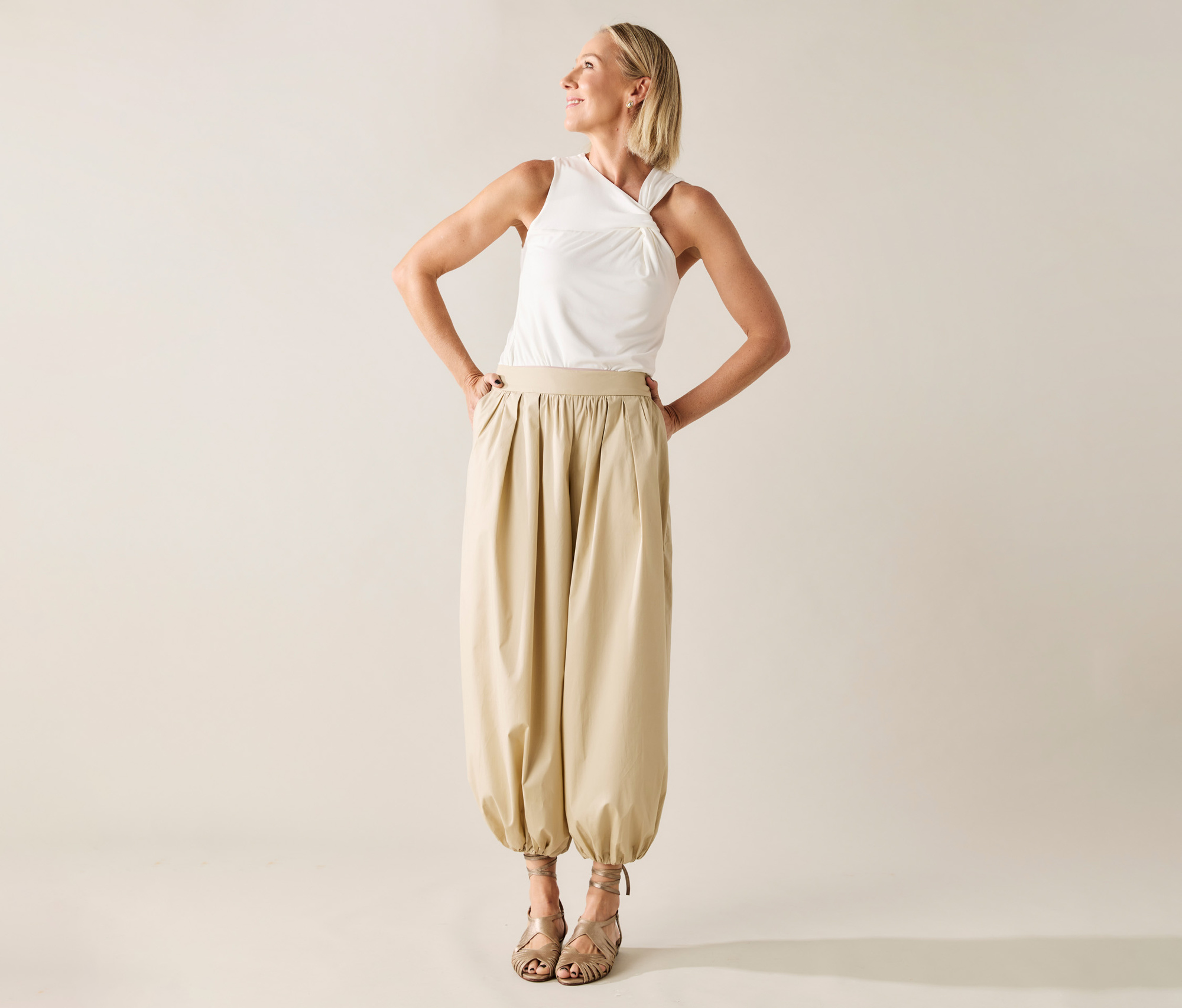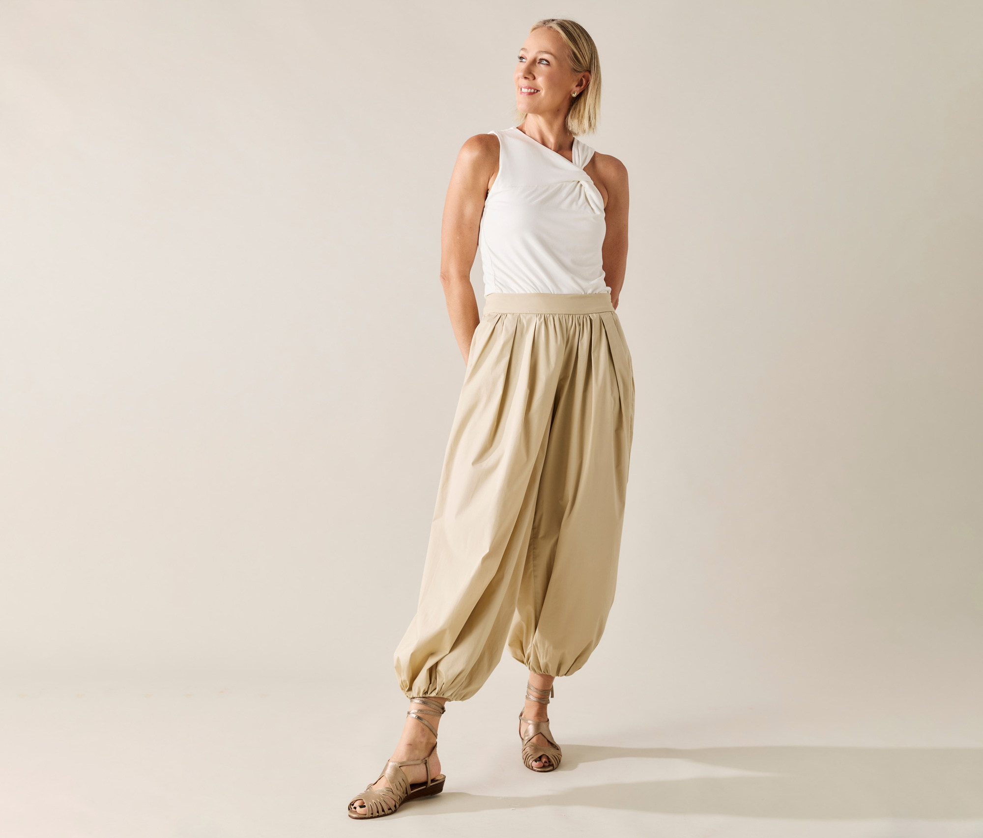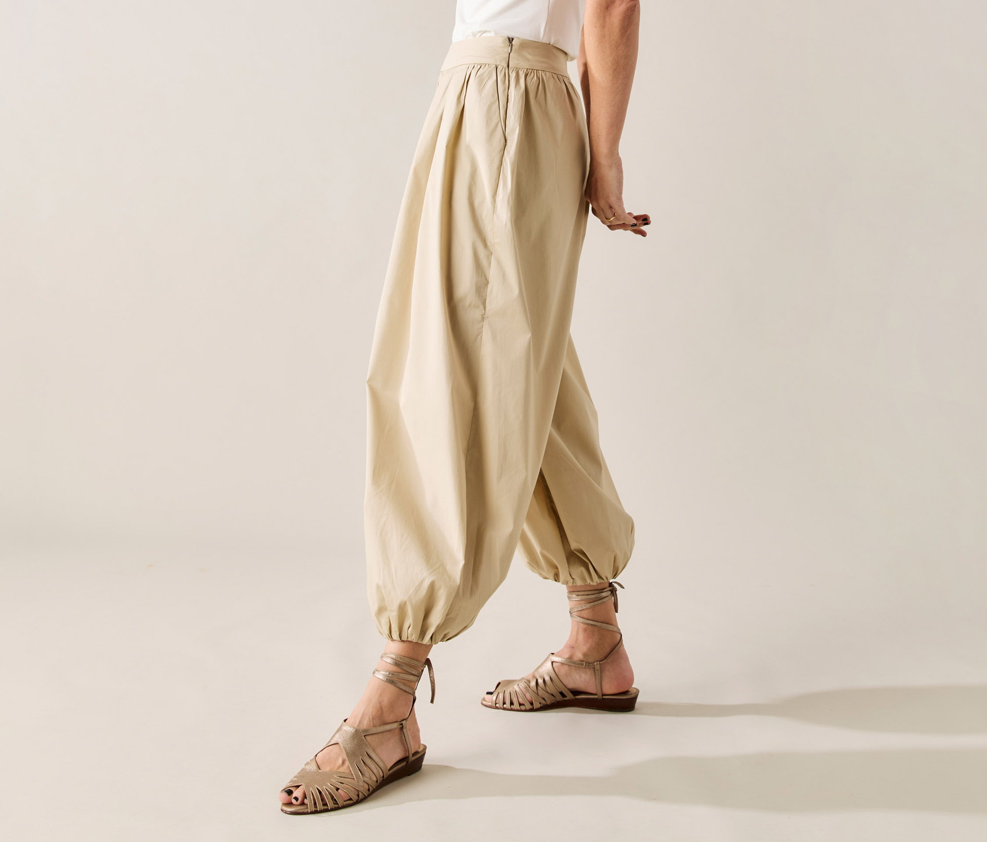 Com modelagem ampla, com pregas frontais, barra com elástico e cós reto com fechamento lateral por zíper, que garantem conforto e proporção equilibrada. Os bolsos laterais funcionais acrescentam praticidade ao uso.