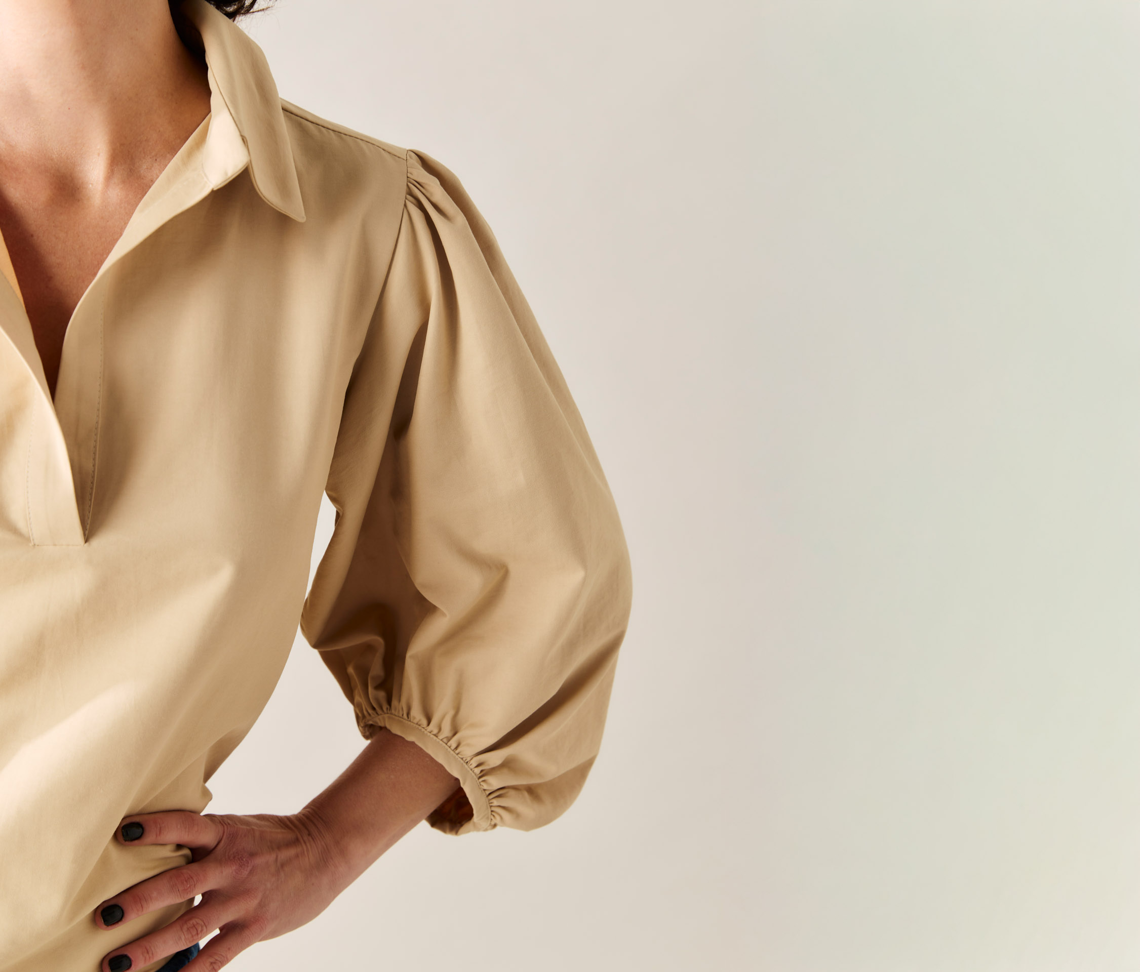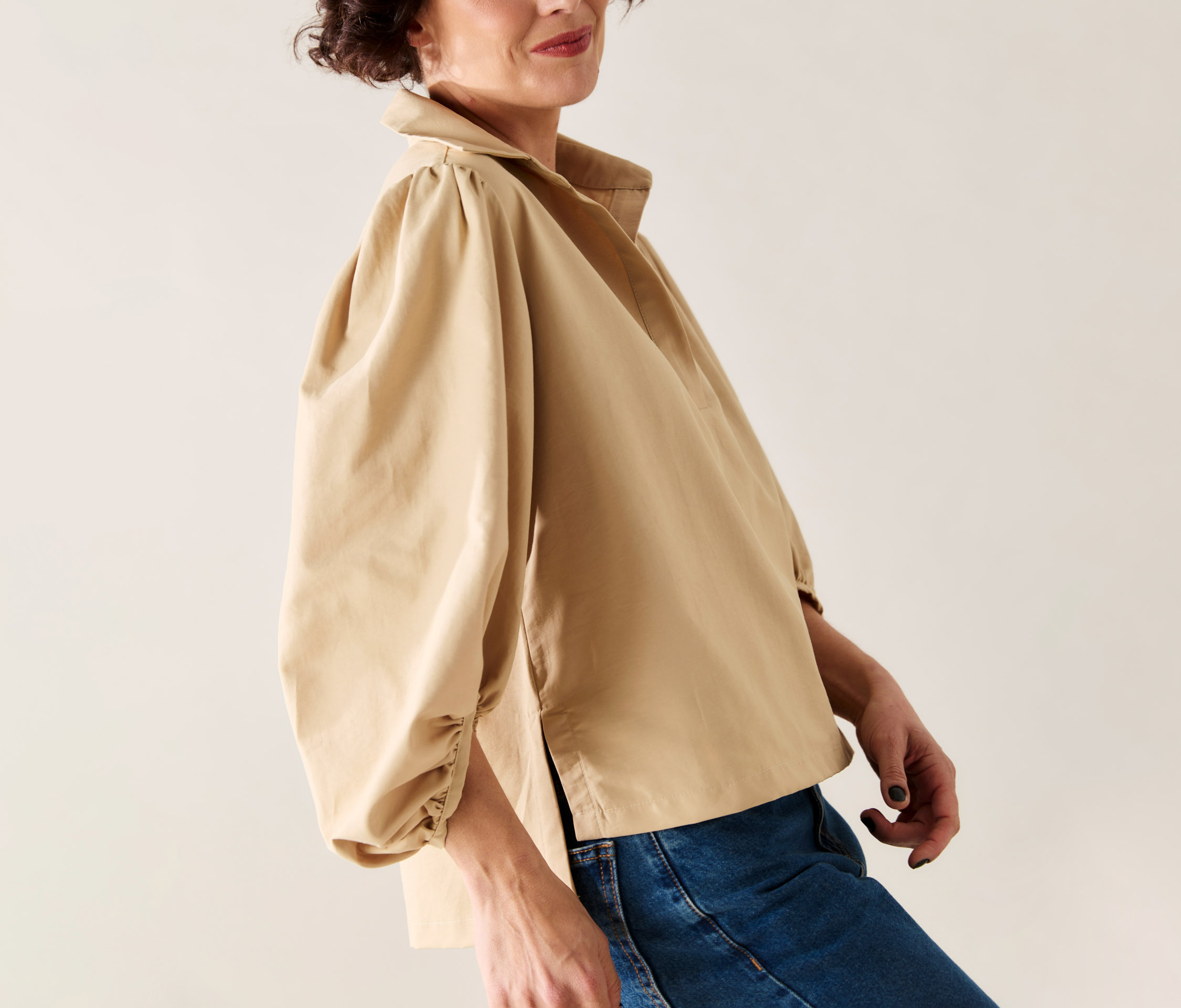 Tecido é encorpado, mas tem aquele toque gostoso e macio que veste bem no corpo. A manga bufante com elástico no punho dá o ar de sofisticação despretensiosa que a gente adora, enquanto o decote em “V” sem botões alonga o colo e traz leveza. O colarinho estruturado faz dela uma peça curinga, que vai do jeans ao linho com a mesma elegância. É aquela blusa “arrumada sem esforço” que resolve o look em dois tempos.