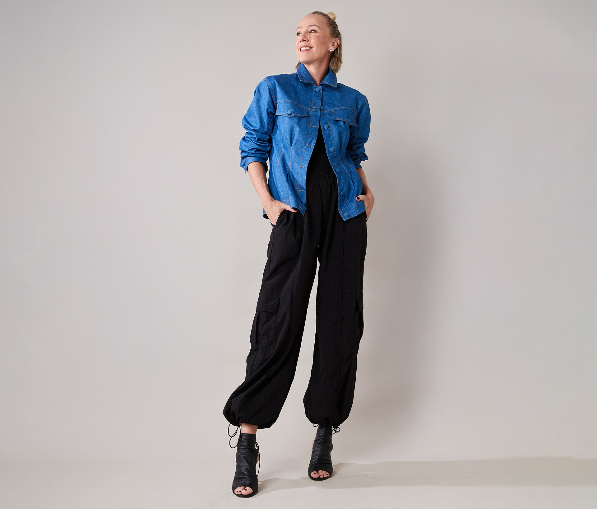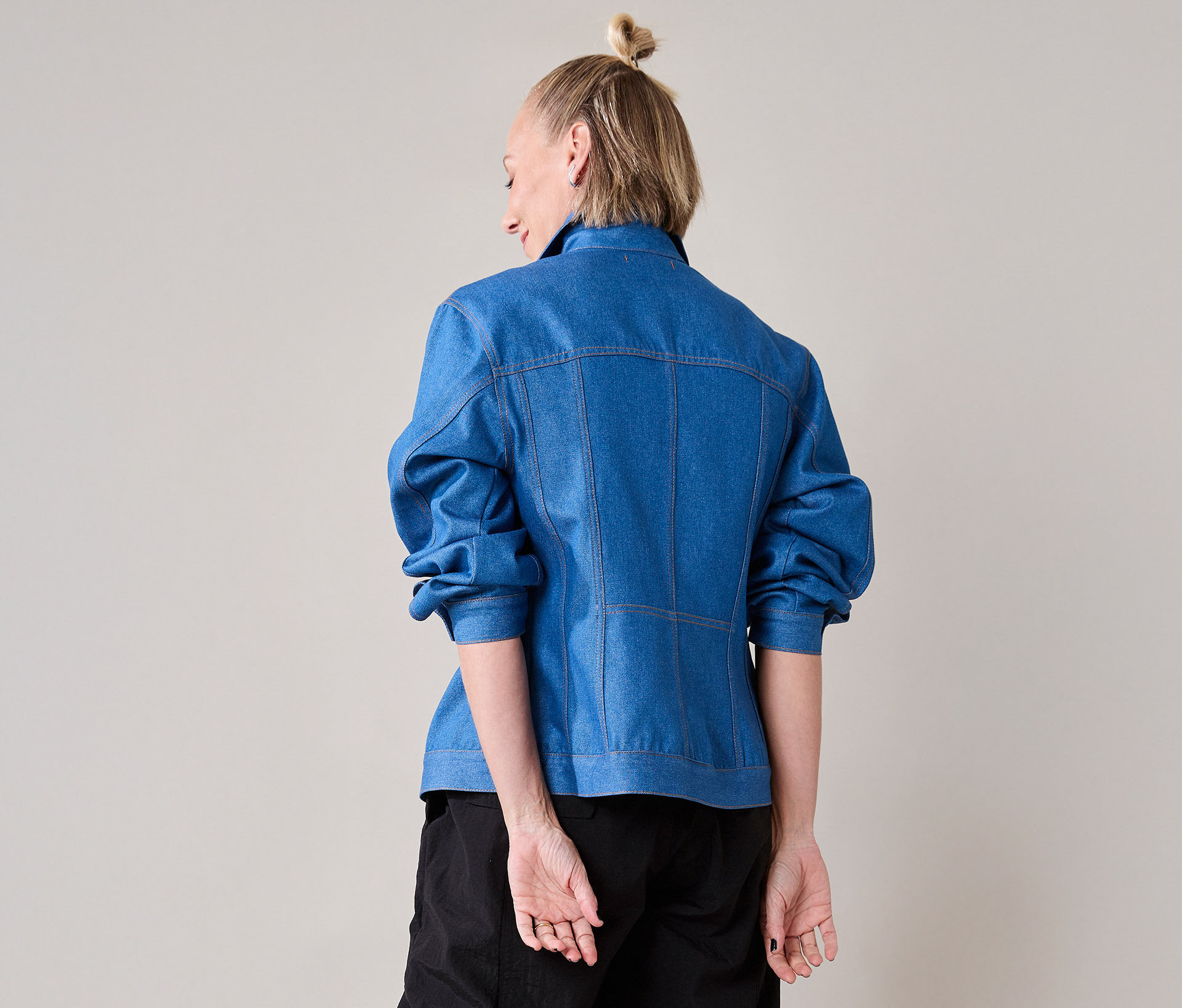 Ela tem o jeitão estruturado da jaqueta, mas veste com leveza de camisa. O corte acinturado + as pregas frontais entregam elegância sem esforço, e o jeans leve faz dela uma parceira de mala  de viagem e do dia a dia.