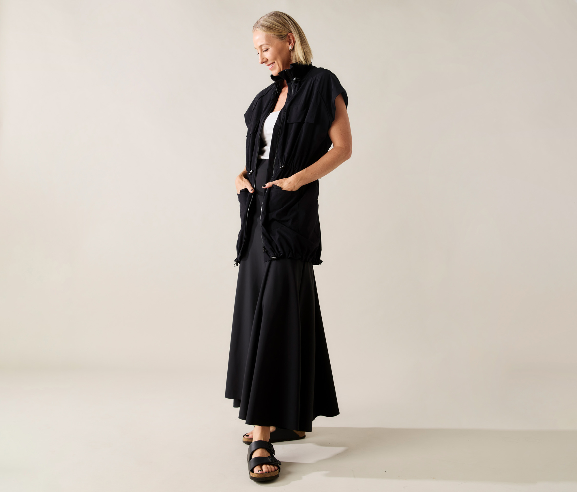 Aquele tecido Tecnológico, respirável, leve, com toque macio, secagem rápida e que desamassa fácil. O Colete Tech é uma peça contemporânea, toda forrada, com ajustes na cintura, gola e barra. Possui uma estética urbana e utilitária e é bastante versátil.