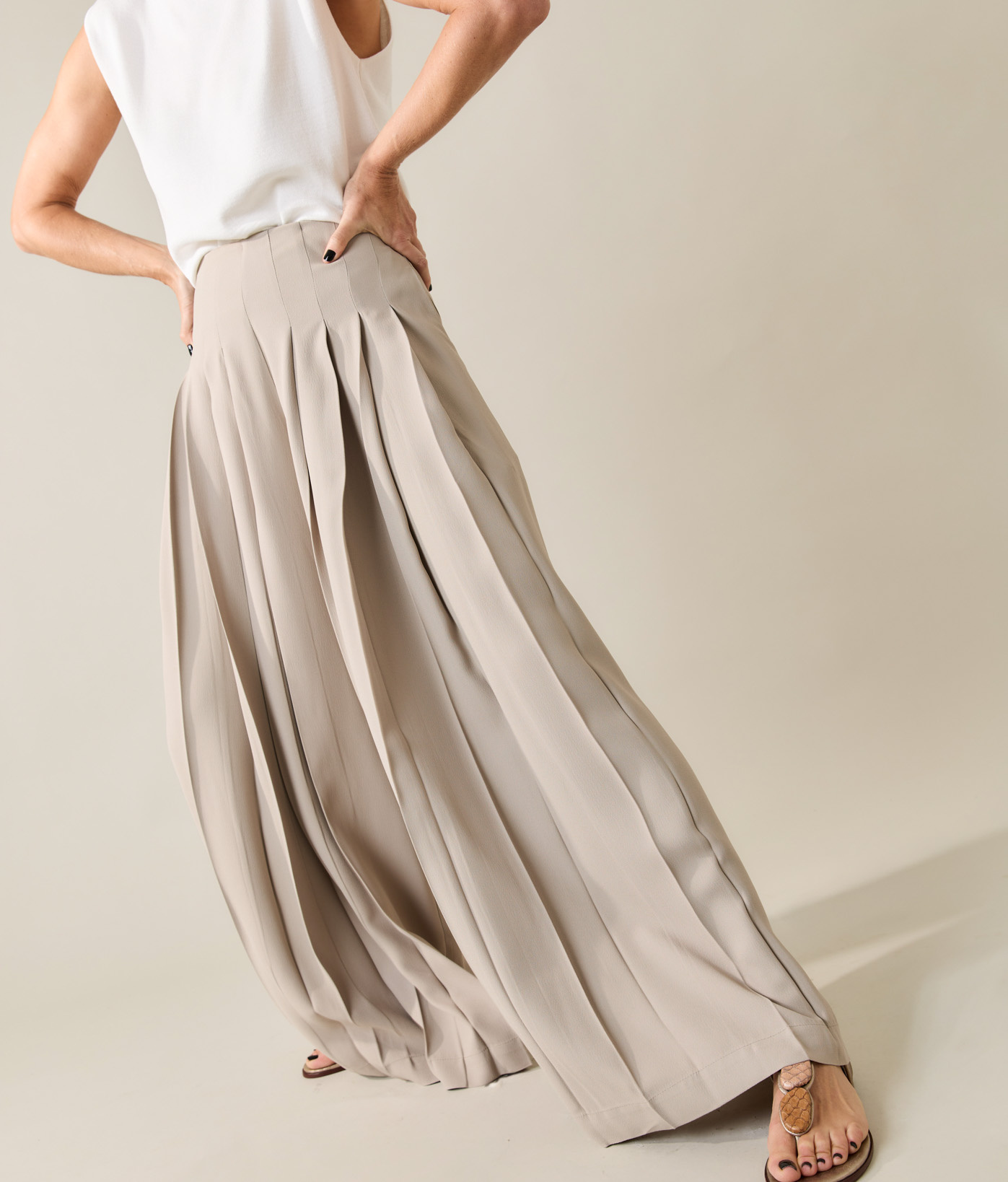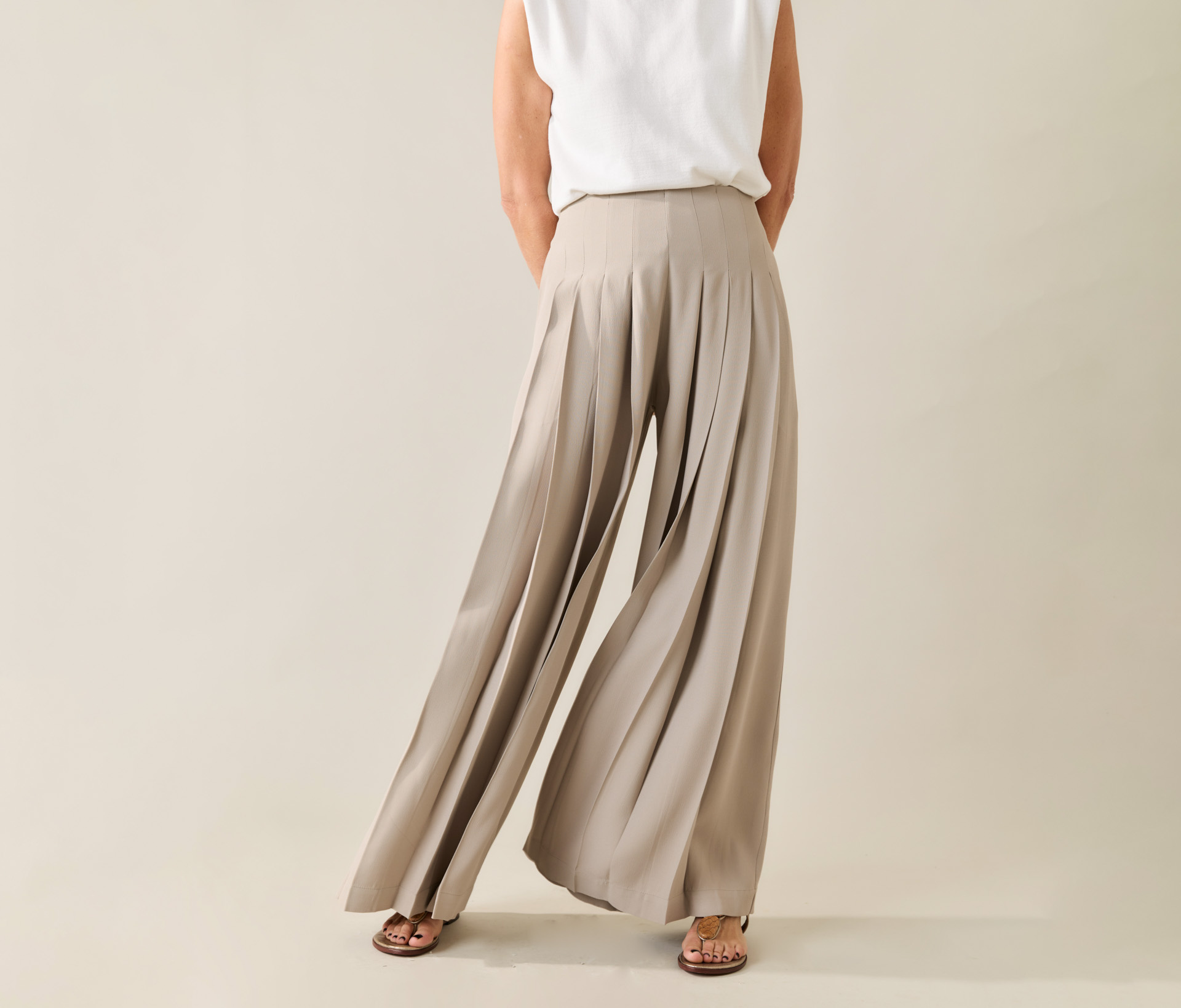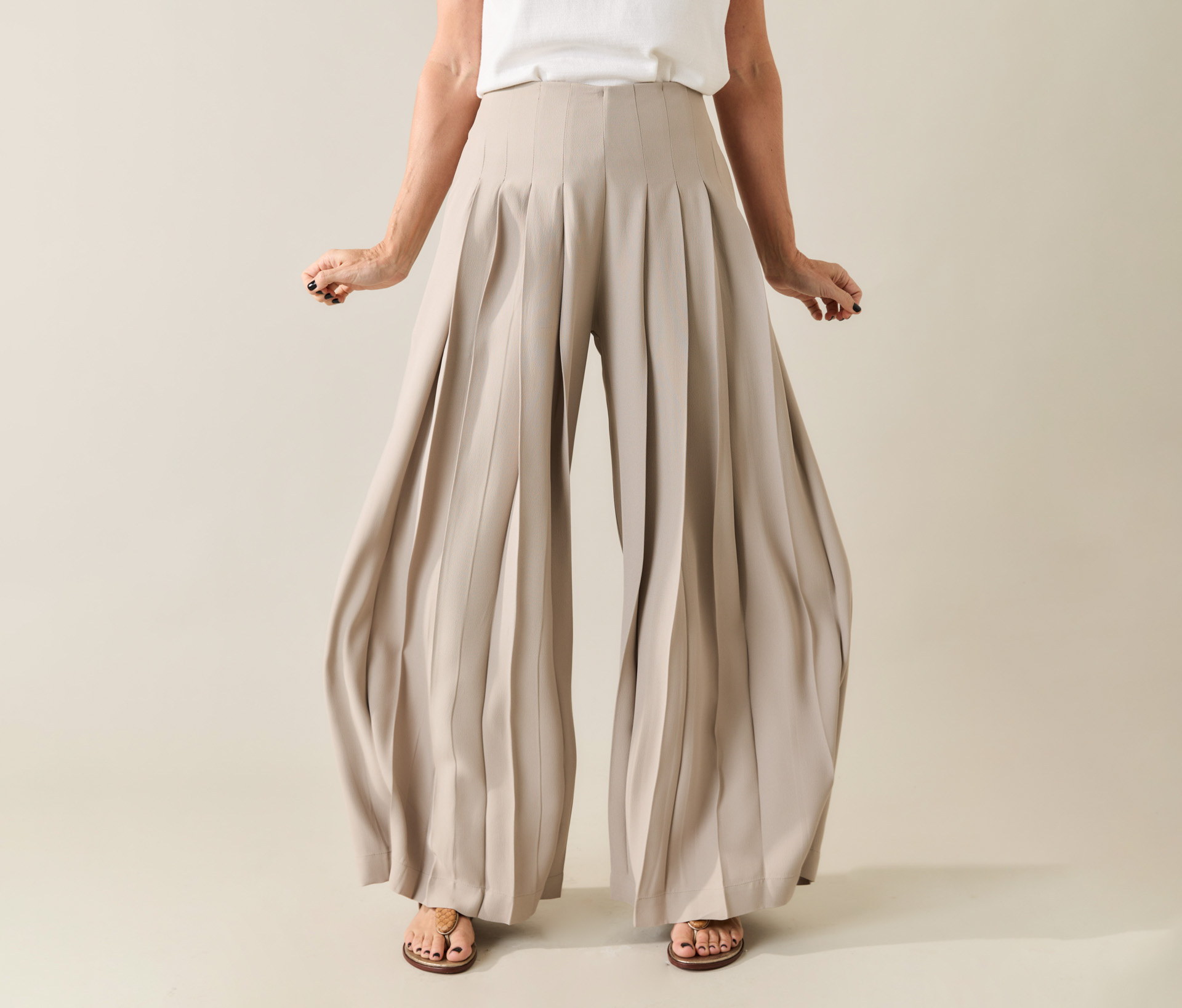 – Com pregas frontais e tecido certificado de origem natural e biodegradável, ela une alfaiataria de alto padrão com consciência