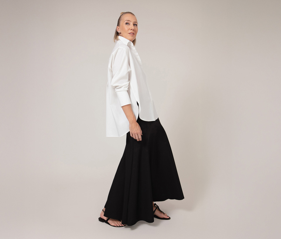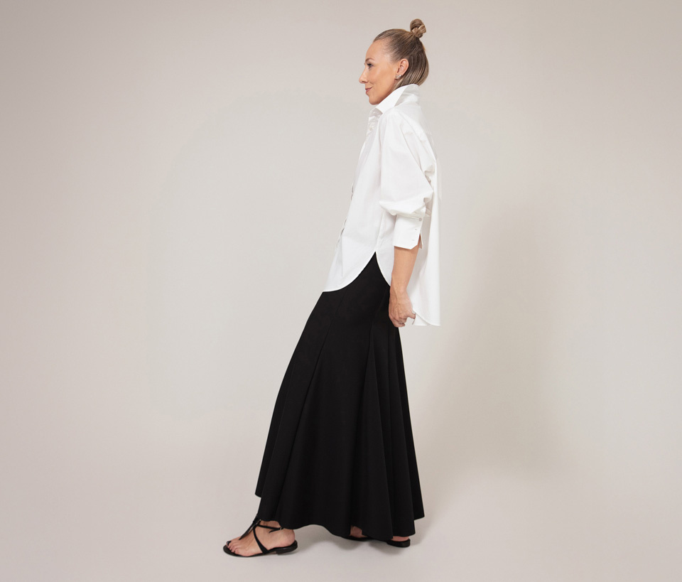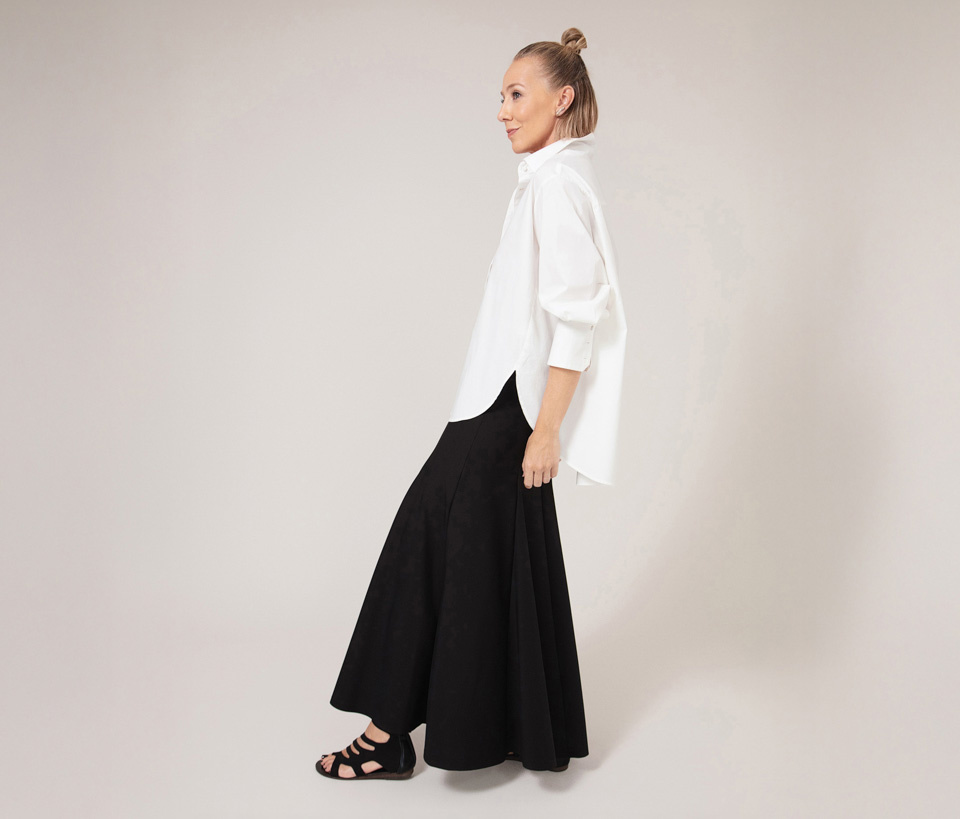 Saia longa confeccionada em malha block (tecido encorpado que lembra um neoprene). Ótima para levar em viagens porque não amassa e resolve aquela roupa mais arrumadona. Tem um impacto visual bacana, mas ainda assim pode ser usada com tênis e tricô criando uma alternativa à calça preta tradicional. Sem falar que esse tipo de material não desbota e dura a vida toda.