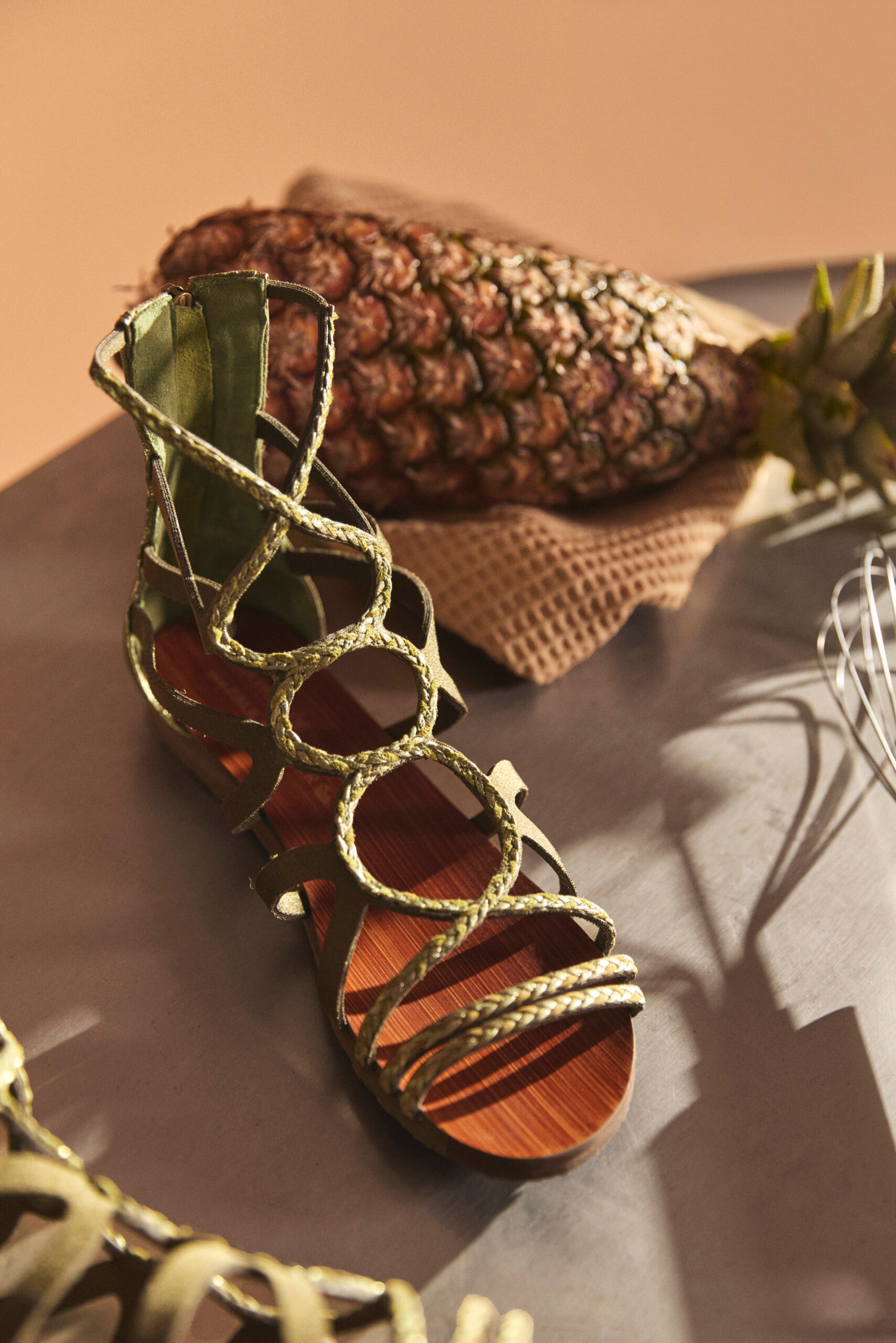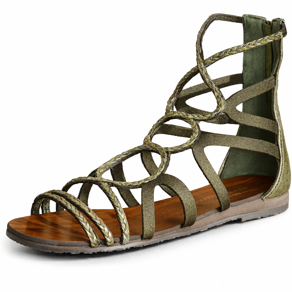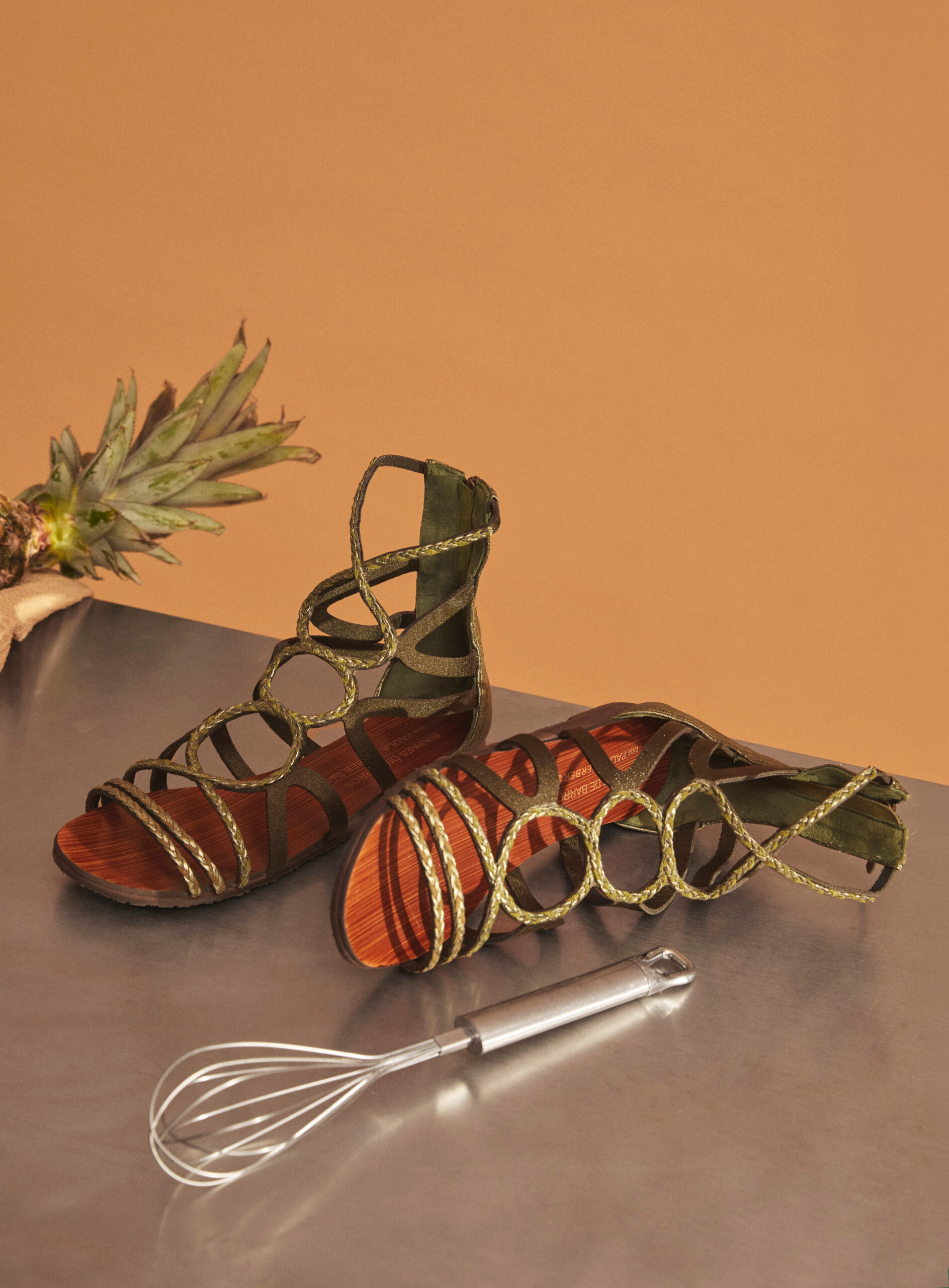 Descrição técnica: Sandália modelo gladiadora com tiras em Tecnolycra na cor verde militar, aplicação de cristais na tonalidade musgo e detalhes em couro vintage cabra na cor army. Possui palmilha na cor café, salto anabelinha padrão, solado em TR (borracha termoplástica) e puxador metálico modelo abacaxi em acabamento ouro velho.