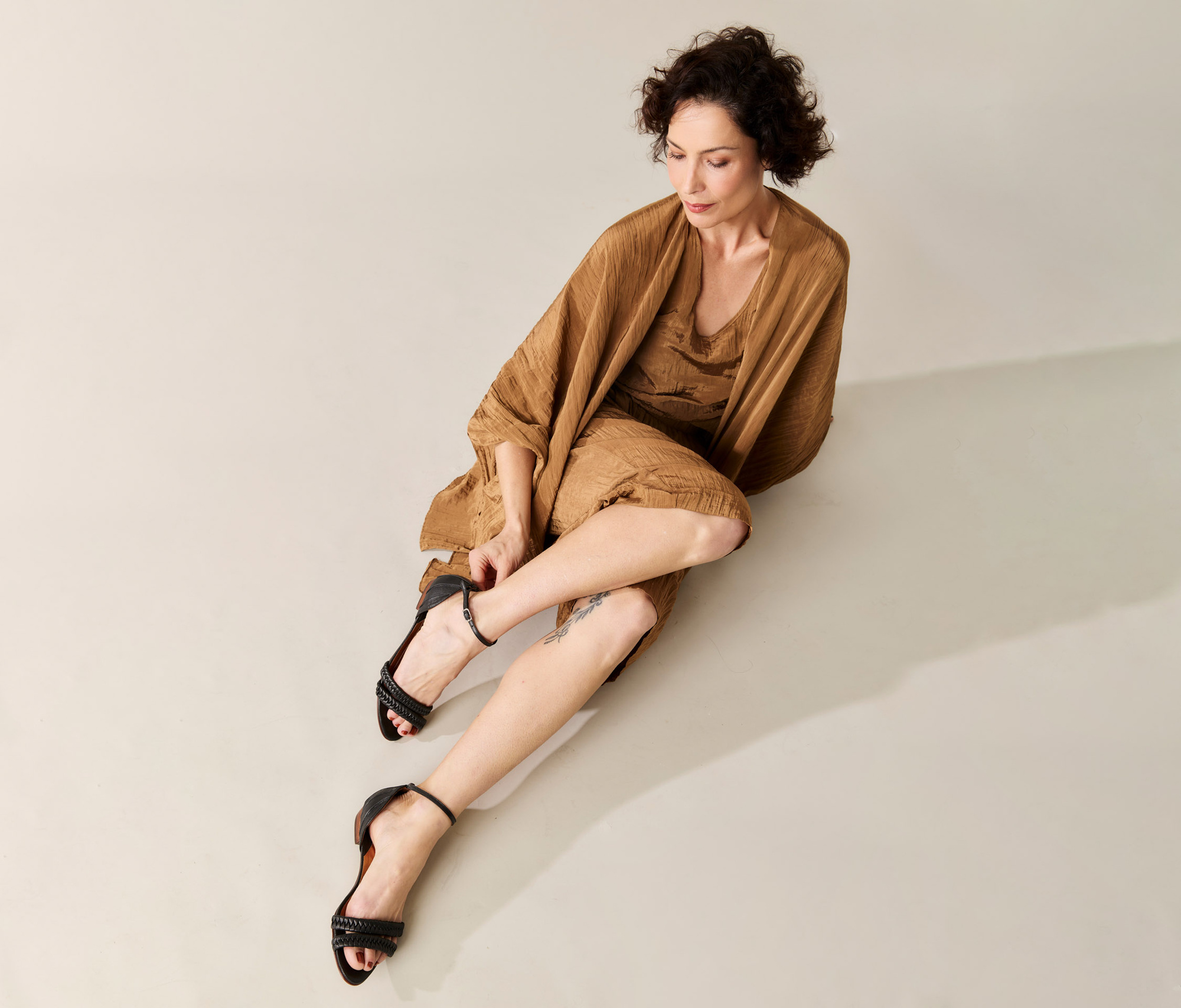 Os delicados trançados que abraçam os dedos e os contornos marcantes na parte traseira revelam um desenho de sutileza e refinamento. O minimalismo se transforma em preciosismo, traduzido em linhas de bom gosto e equilíbrio. Produzida em um dos couros mais nobres e macios, combina camurça metalizada preta nos detalhes e couro de cabra nos trançados. Fechamento por fivela | Salto 1,5 cm.