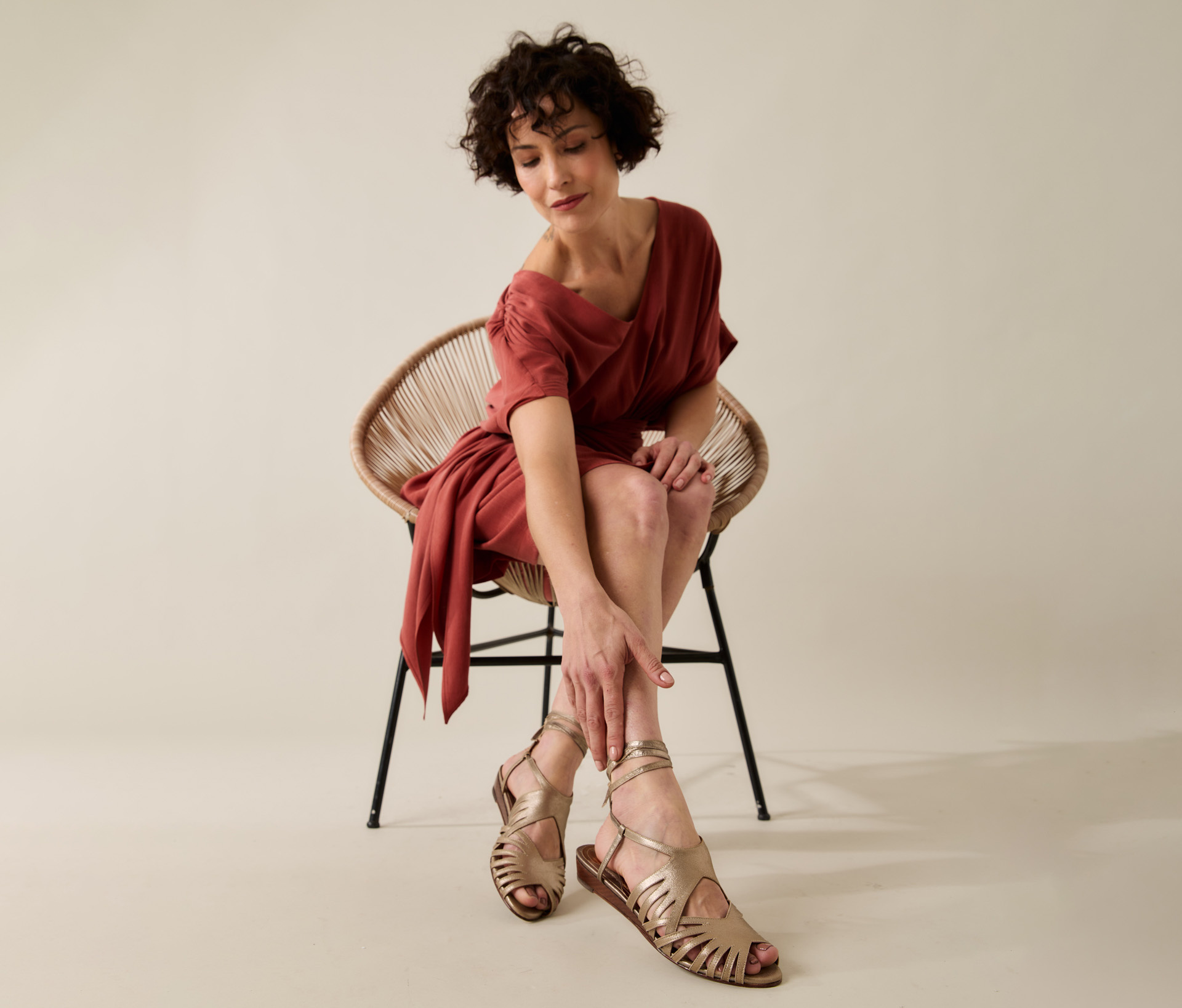 Rasteira leve e delicada. Possui tiras finas que se entrelaçam harmoniosamente, subindo até o tornozelo em amarrações elegantes que valorizam o desenho das pernas. Feita em couro de cabra tipo camurça metálica no tom ouro branco. O salto anabela de 4cm revestido em couro de fachete de sola proporciona uma leve elevação sem abrir mão da leveza.