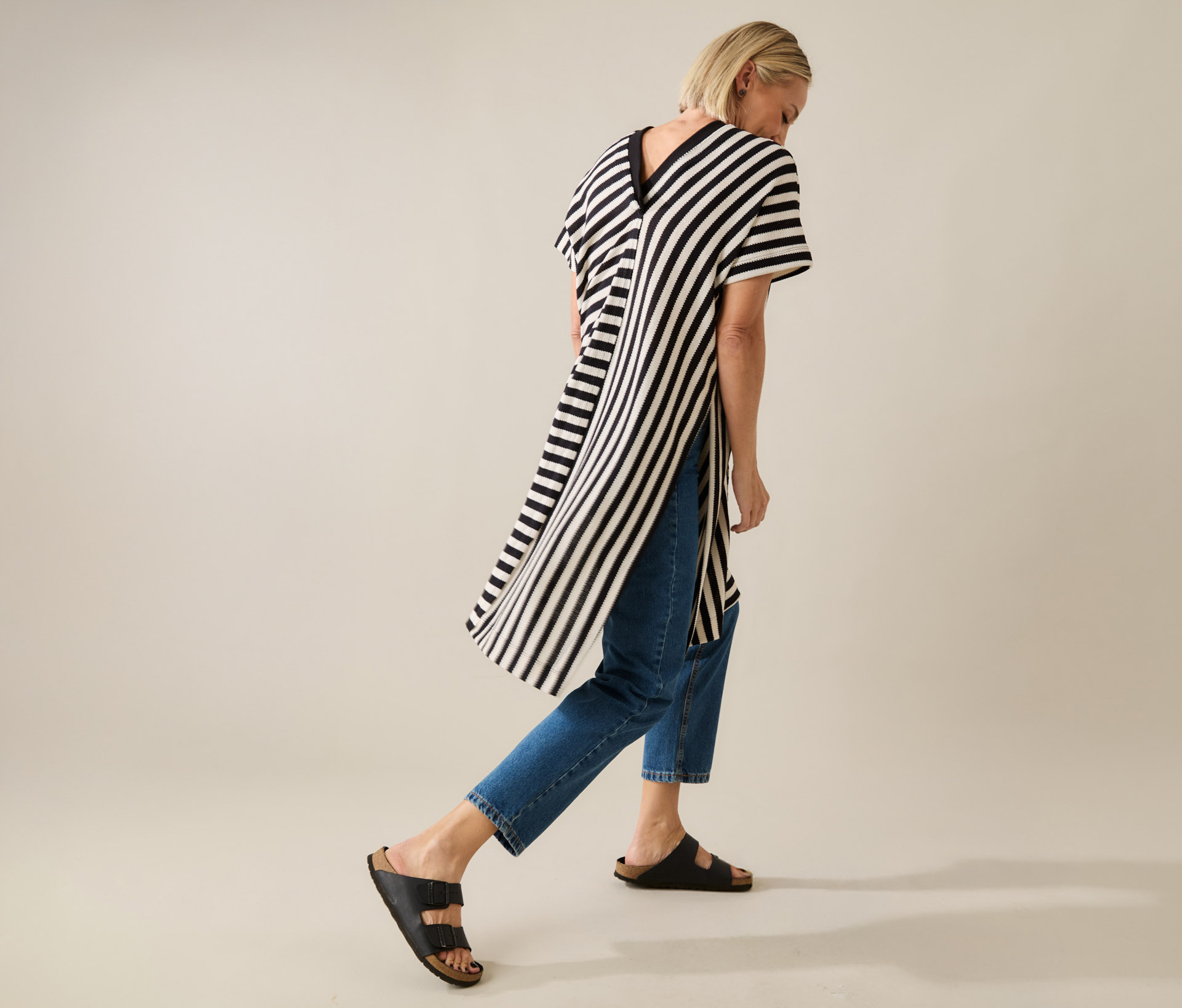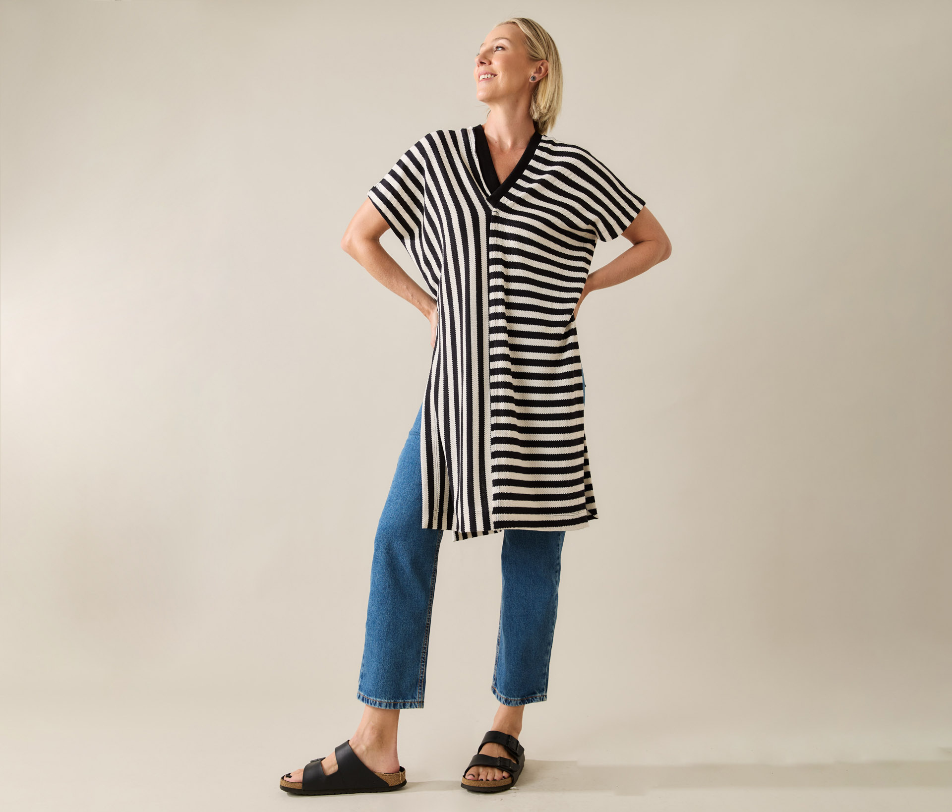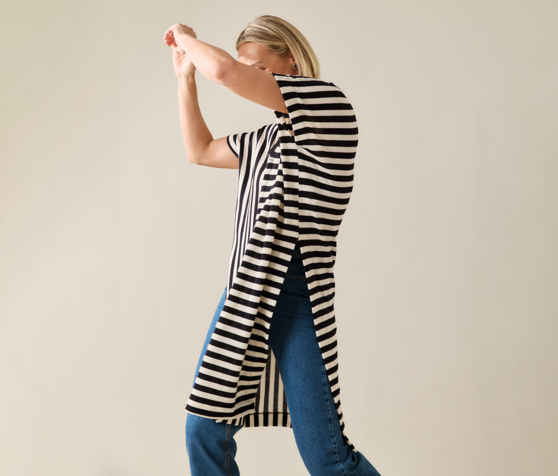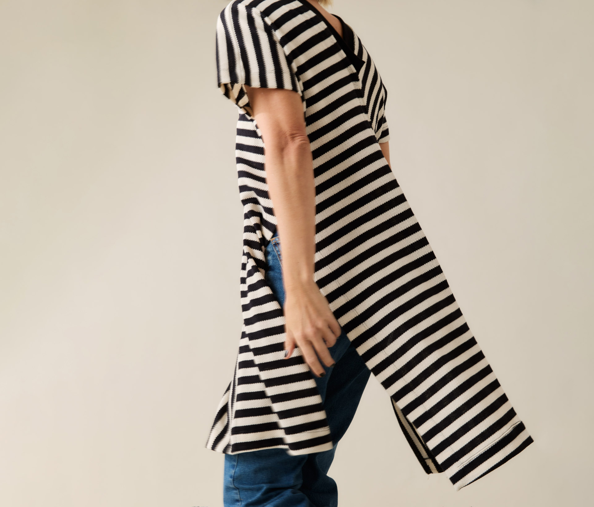Pra quem ama uma peça com presença, mas que continua fácil de usar. Essa blusa listrada é longa, tem uma malha encorpada e texturizada que veste super bem, e um decote em V com acabamento de punho que deixa tudo mais interessante.