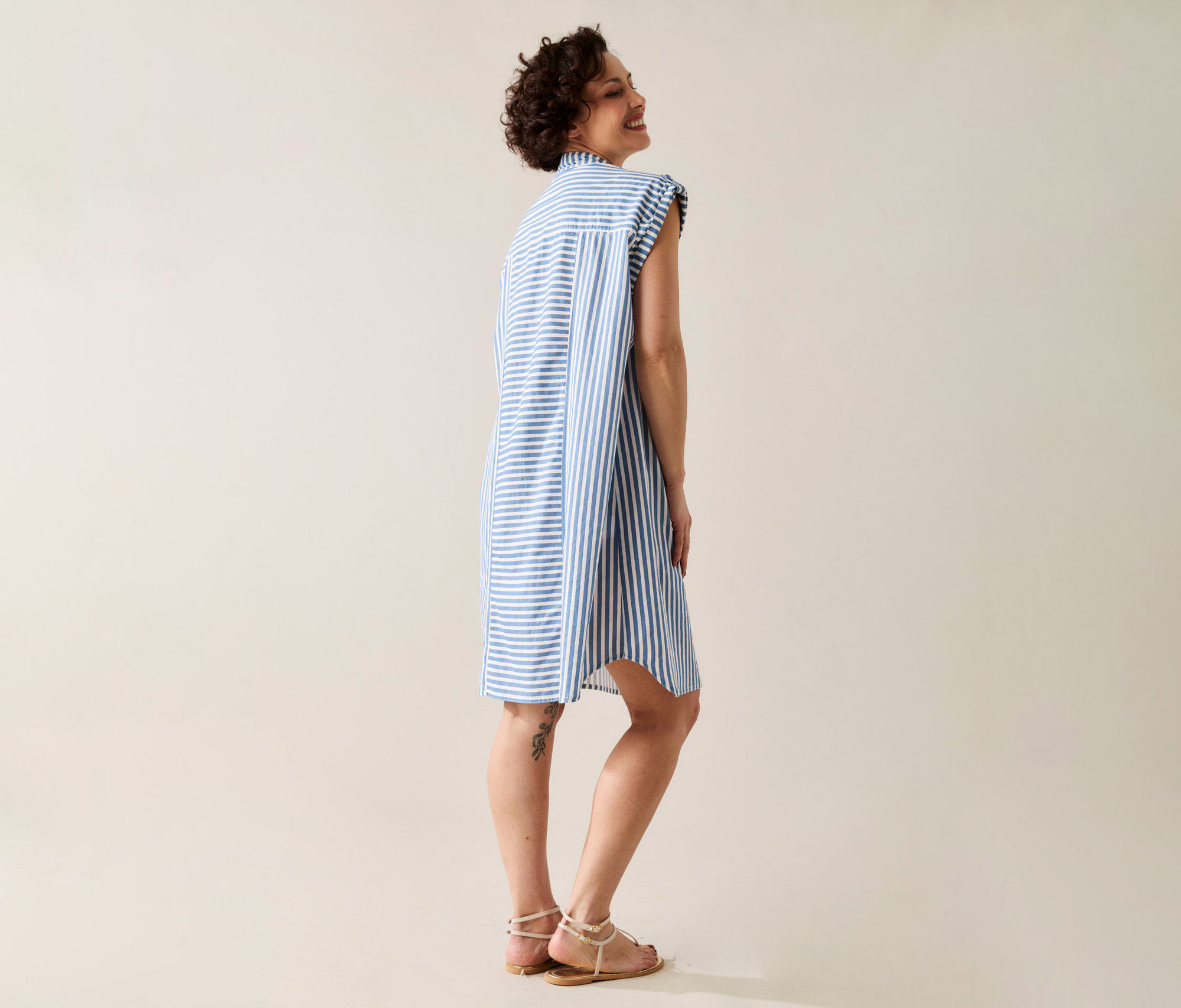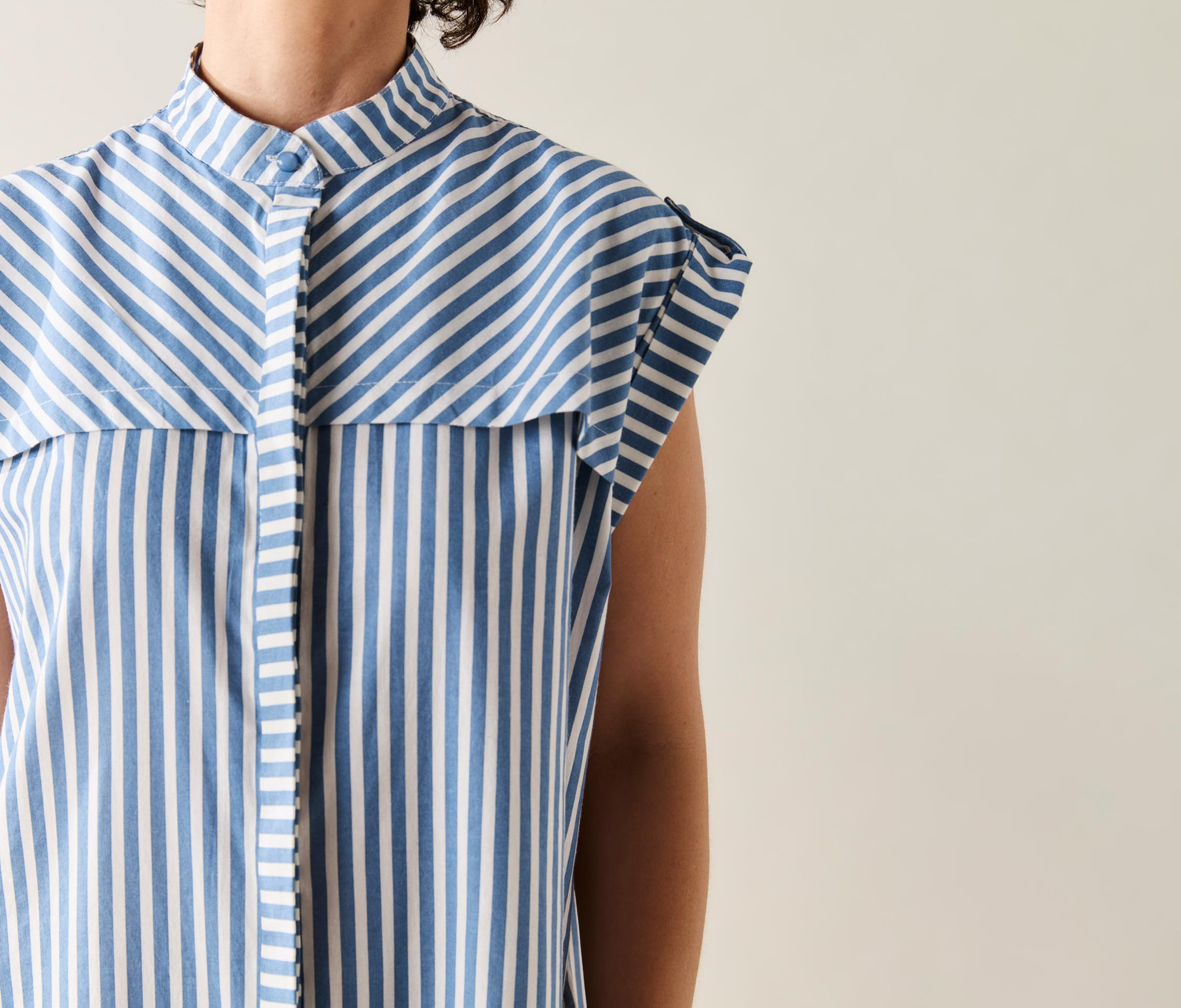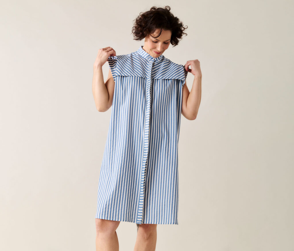 Túnica que transita da praia para cidade, com caimento reto, mídi, fechamento por botões e modelagem solta ao corpo. Em tecido de camisaria possui detalhe de botão de resina nos ombros e na gola.