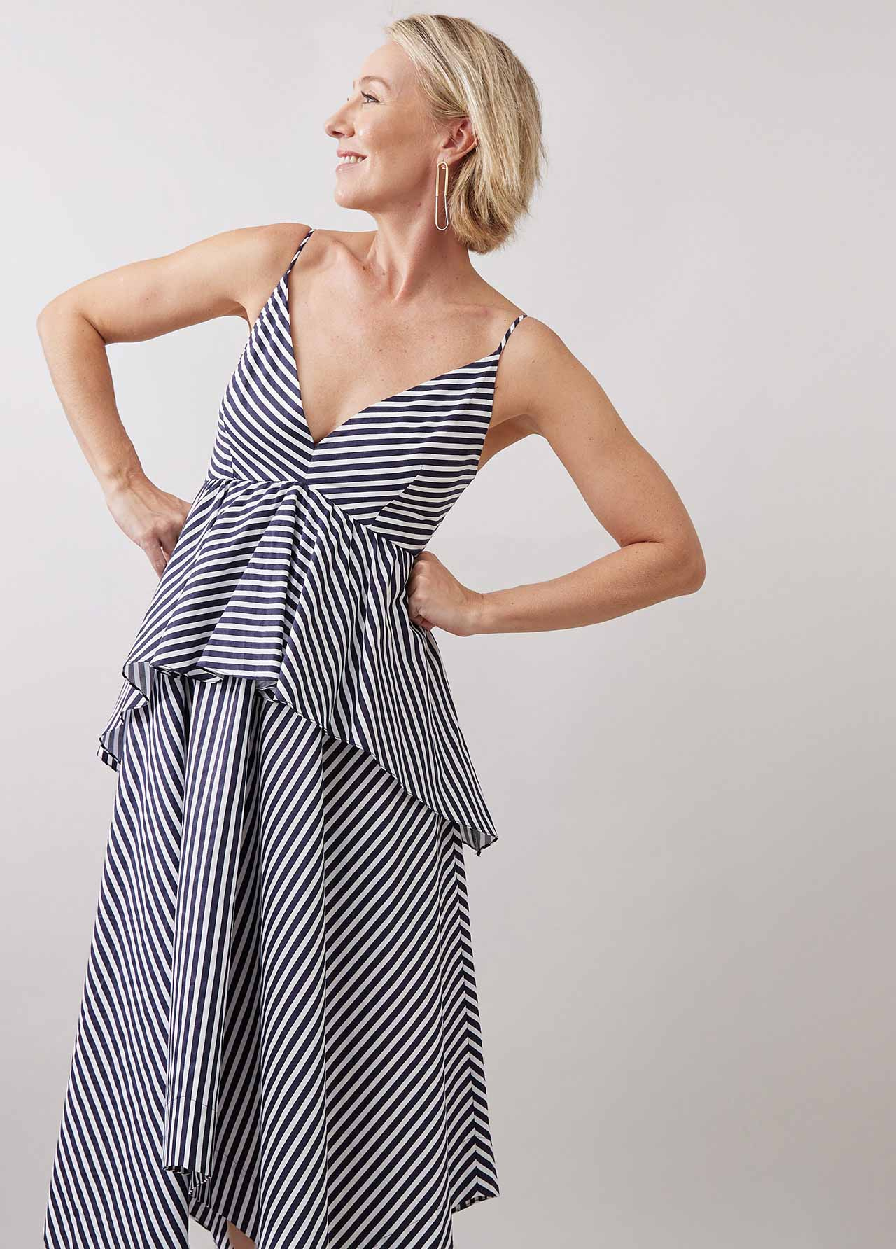 Vestido para chegar chegando naquele almoço arrumadão ou em um jantar na praia. Listrado para não enjoar e ainda deixar a roupa alegre na medida. Seu tecido casual faz toda a diferença no seu grau de despretensão. Possui uma alça reguladora para que seja legal ajustar no busto conforme fique mais confortável.
