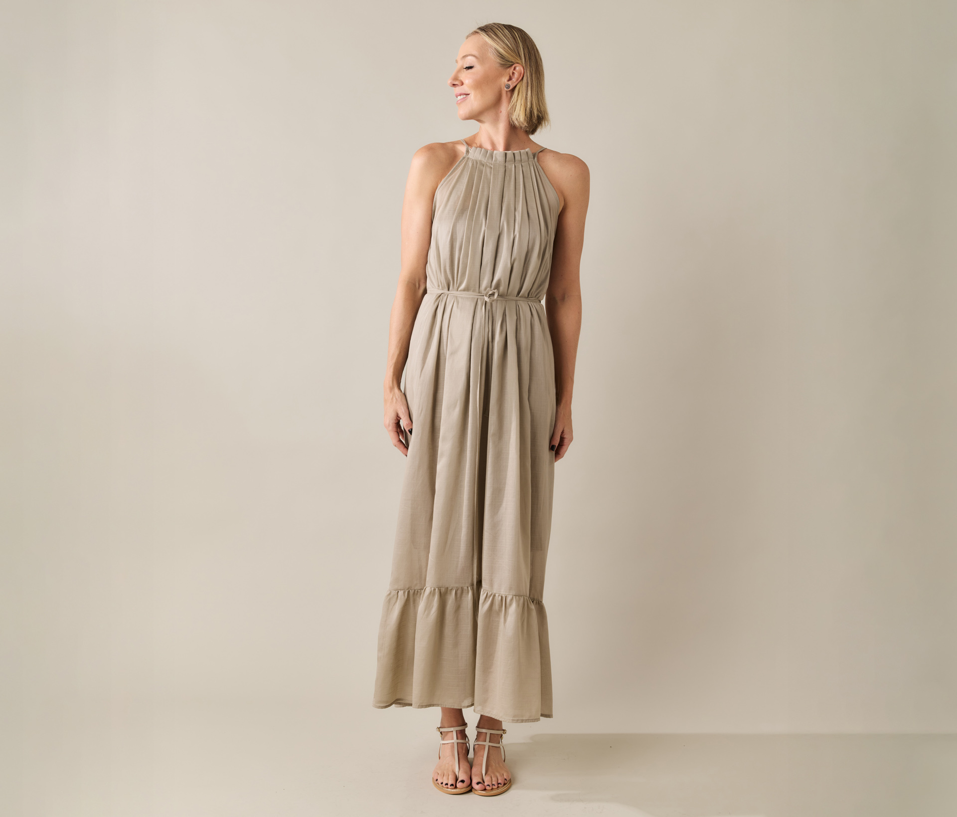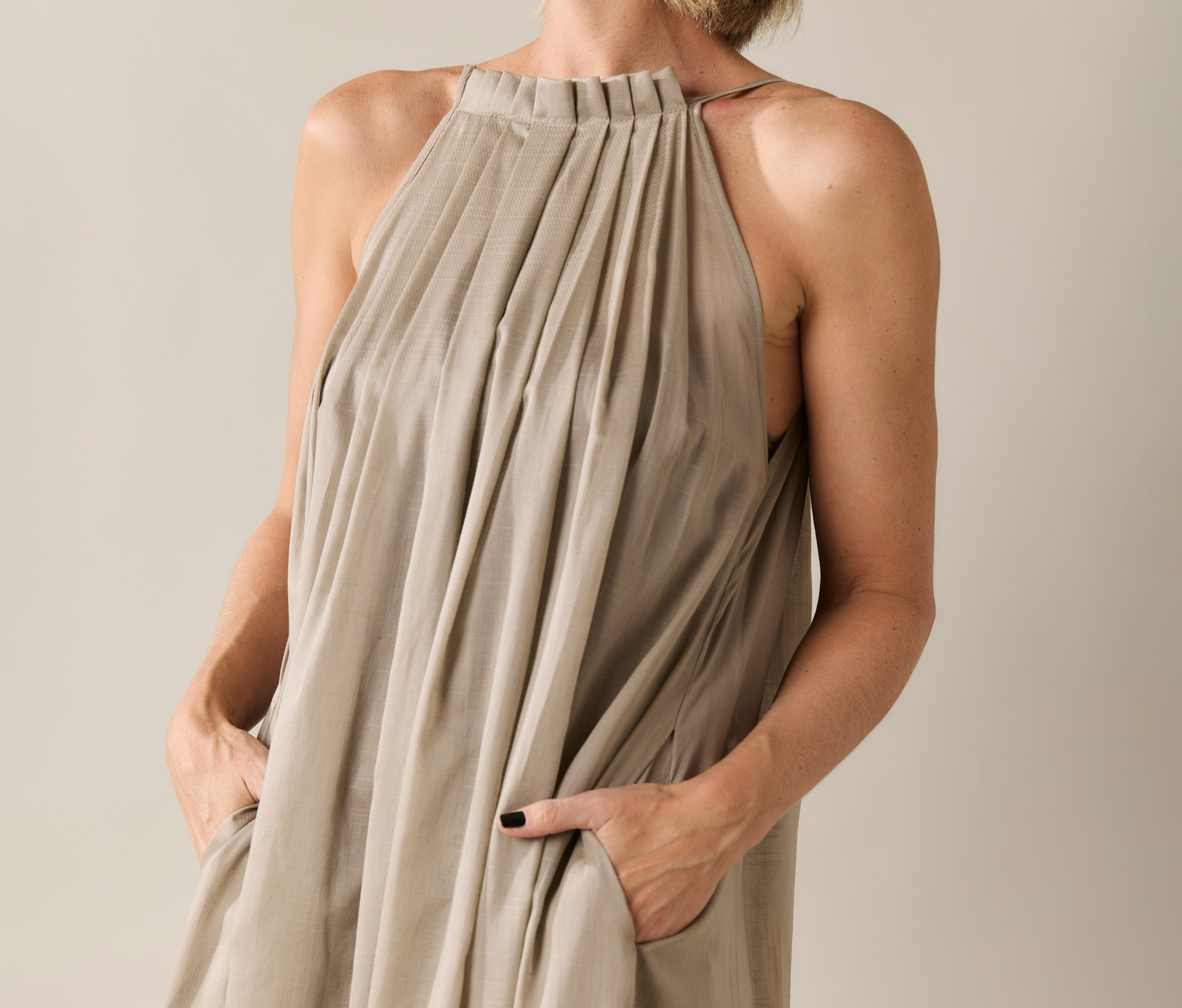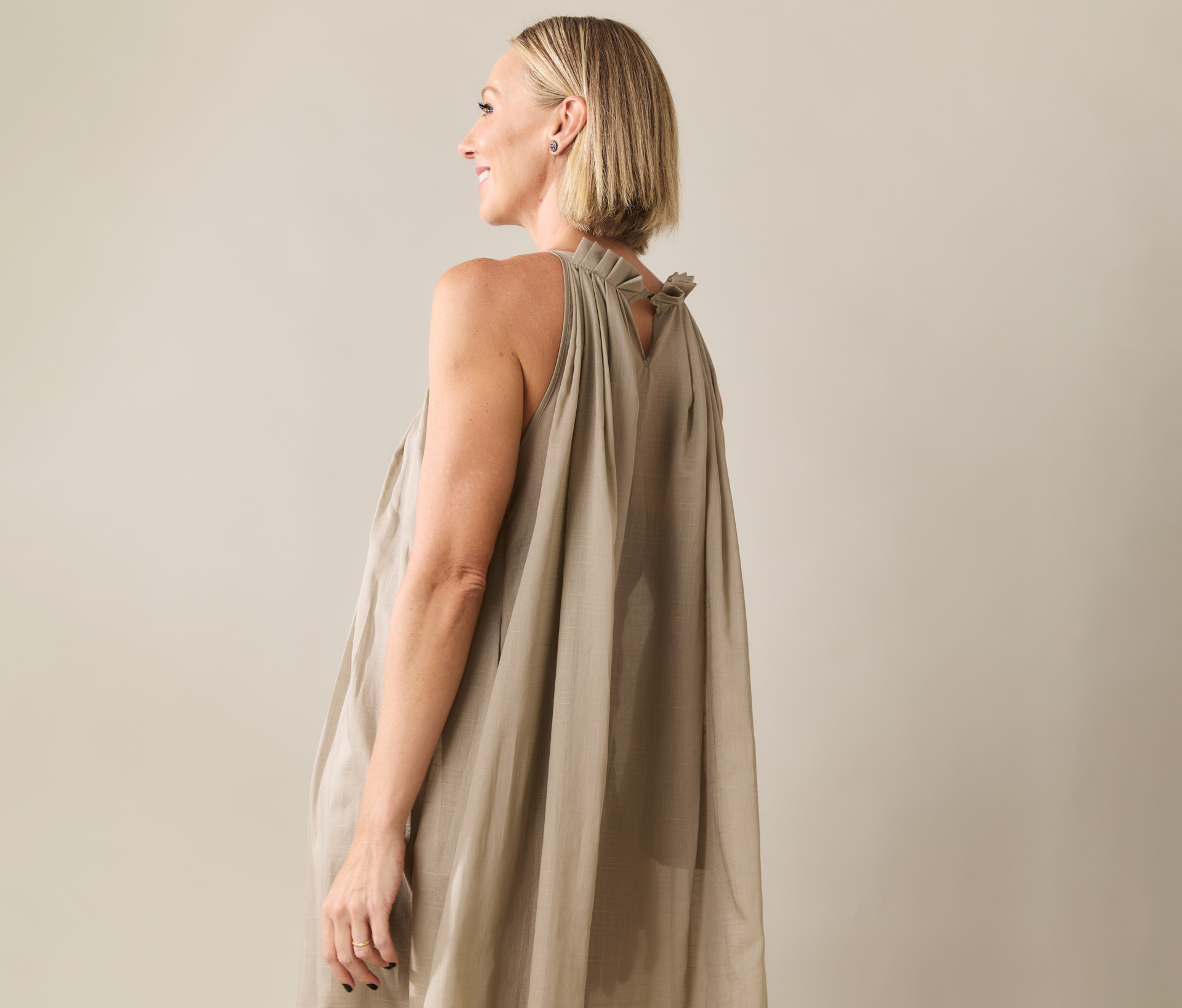 O Vestdo Day Off já carrega no nome a sensação de final de semana. Solto, leve e macio, ele acompanha o corpo sem apertar, deixando o vento brincar com o tecido a cada passo. A cor traz a neutralidade elegante que combina com tudo. Sem mangas e com alças fininhas, ele é fluido e descomplicado, daquelas peças que você veste sem pensar e que funcionam do café da manhã despretensioso até o pôr do sol na praia.