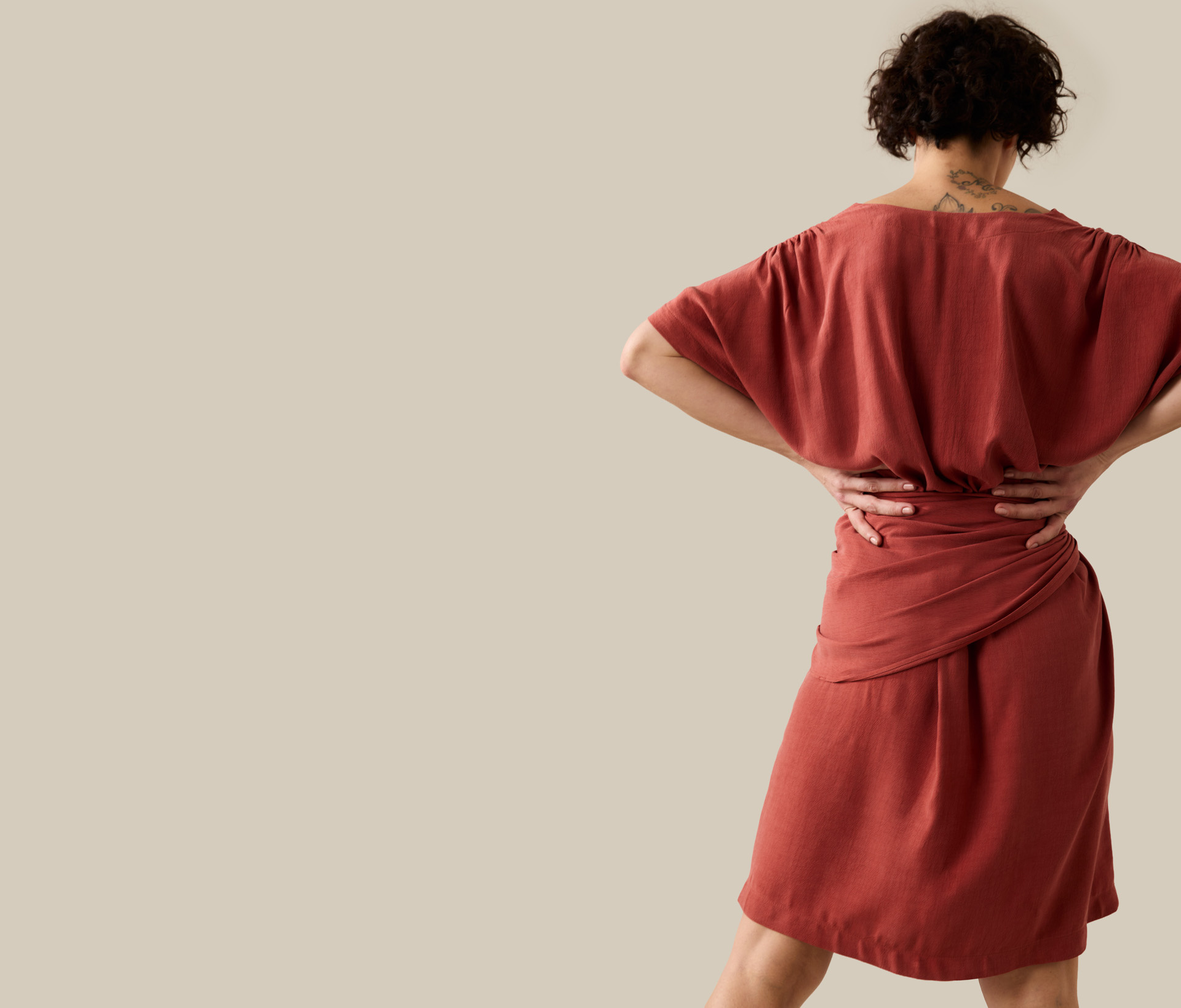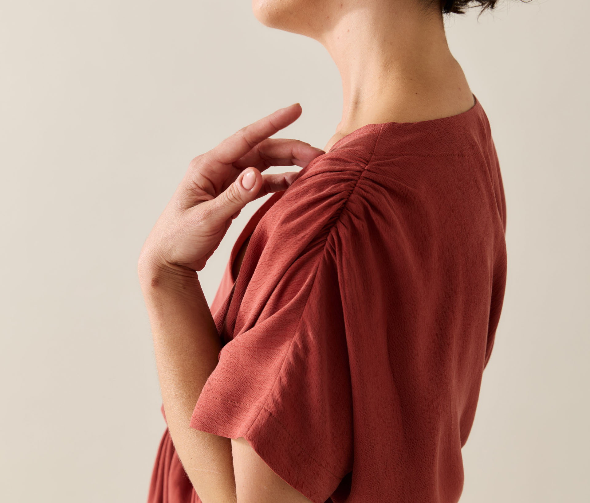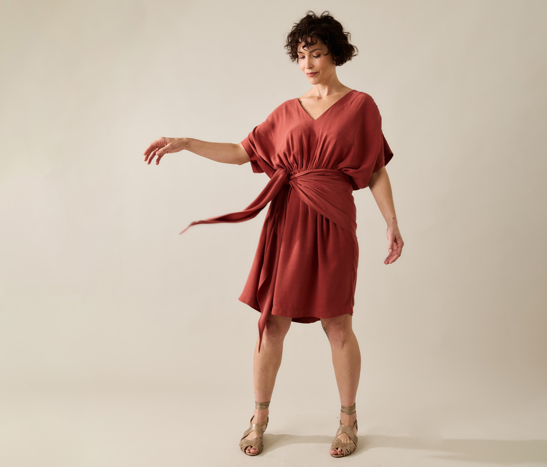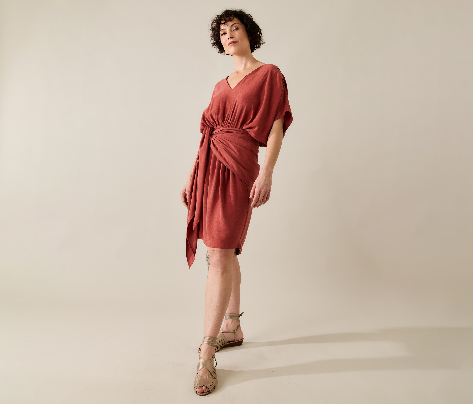 – Amplo, com modelagem soltinha e cintura marcada pelo elástico, tem manga com franzido e um lenço avulso que pode ser amarrado de vários jeitos;